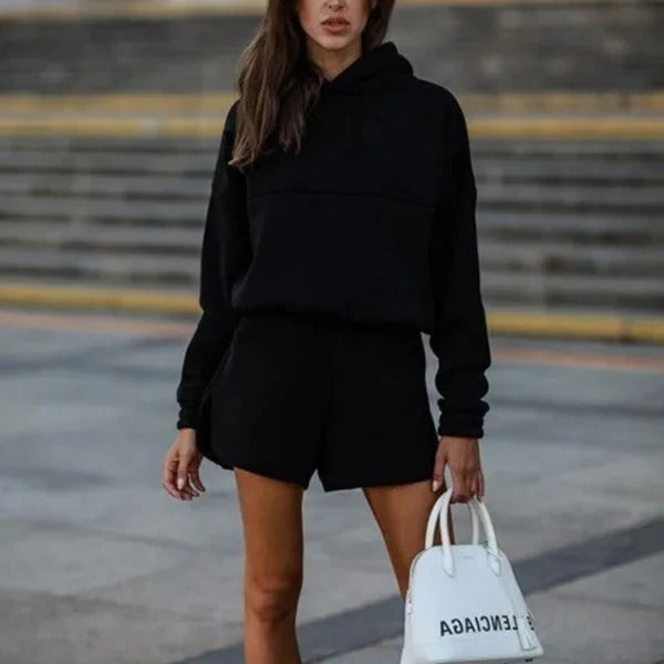 - Design: Oversized loungewear-stil med huvtröja och matchande shorts