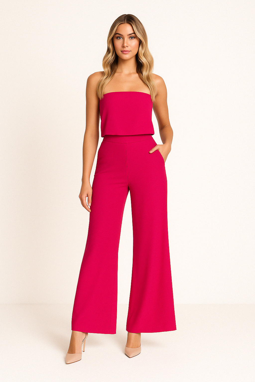 - Design: Off-shoulder axelbandslös topp med högmidjad utsvängd byxa