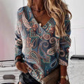 - Design: V-ringning, avslappnad passform, med ornamentalt tryck och långa ärmar