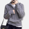 - Design: Kabelstickad, halvdragkedja, ribbade kanter, avslappnad passform