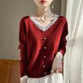 - Ontwerp: Relaxed fit, V-hals met kantdetail, lange mouwen, decoratieve knoopjes