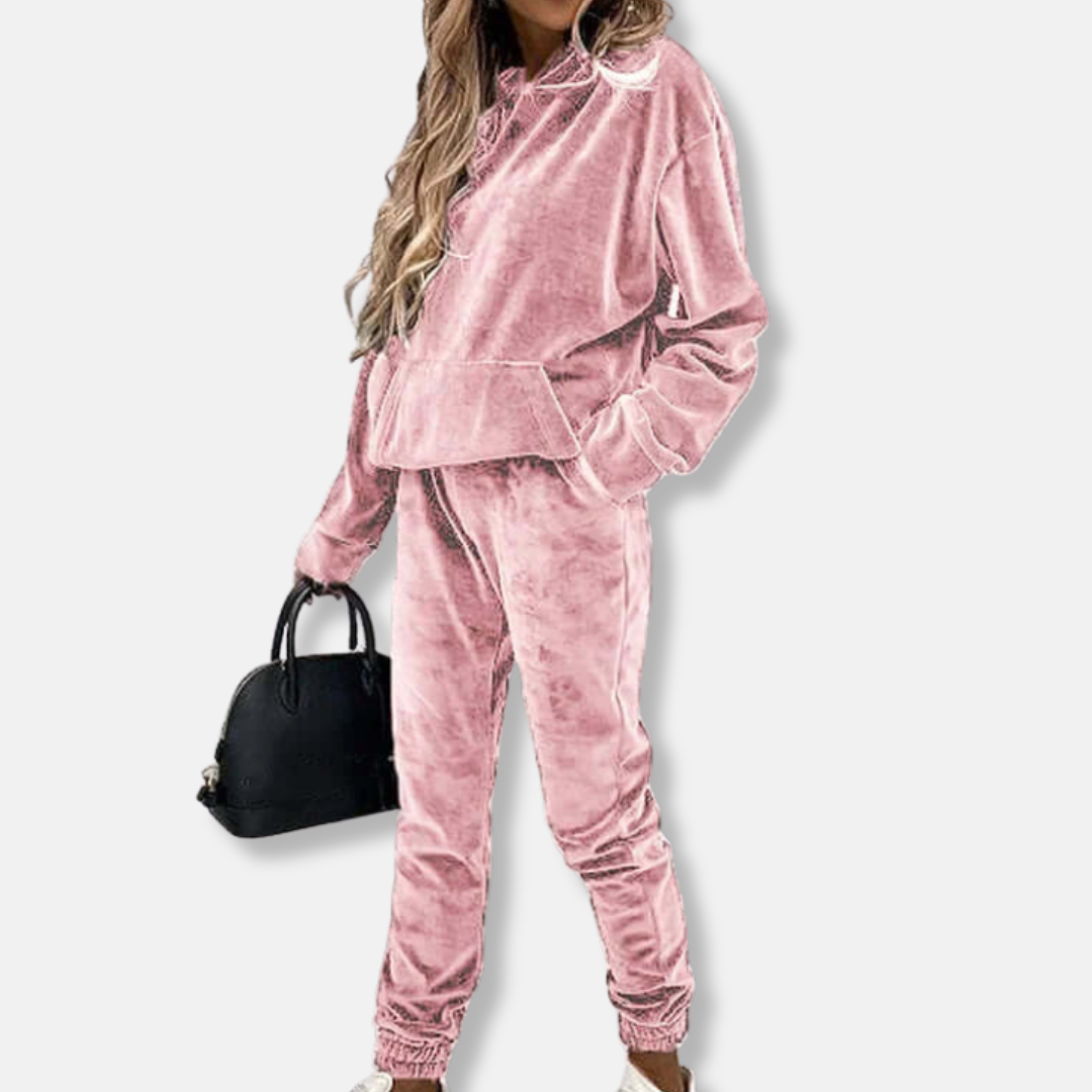 Detta tvådelade set för damer, tillverkat i sammet med en avslappnad passform, ger en koordinerad look för bekväma stunder.