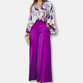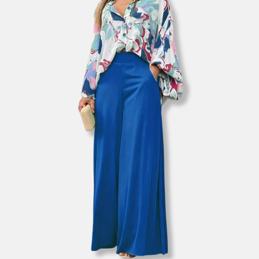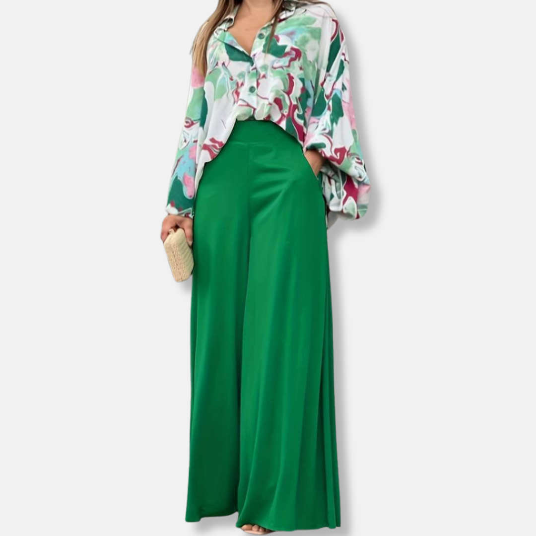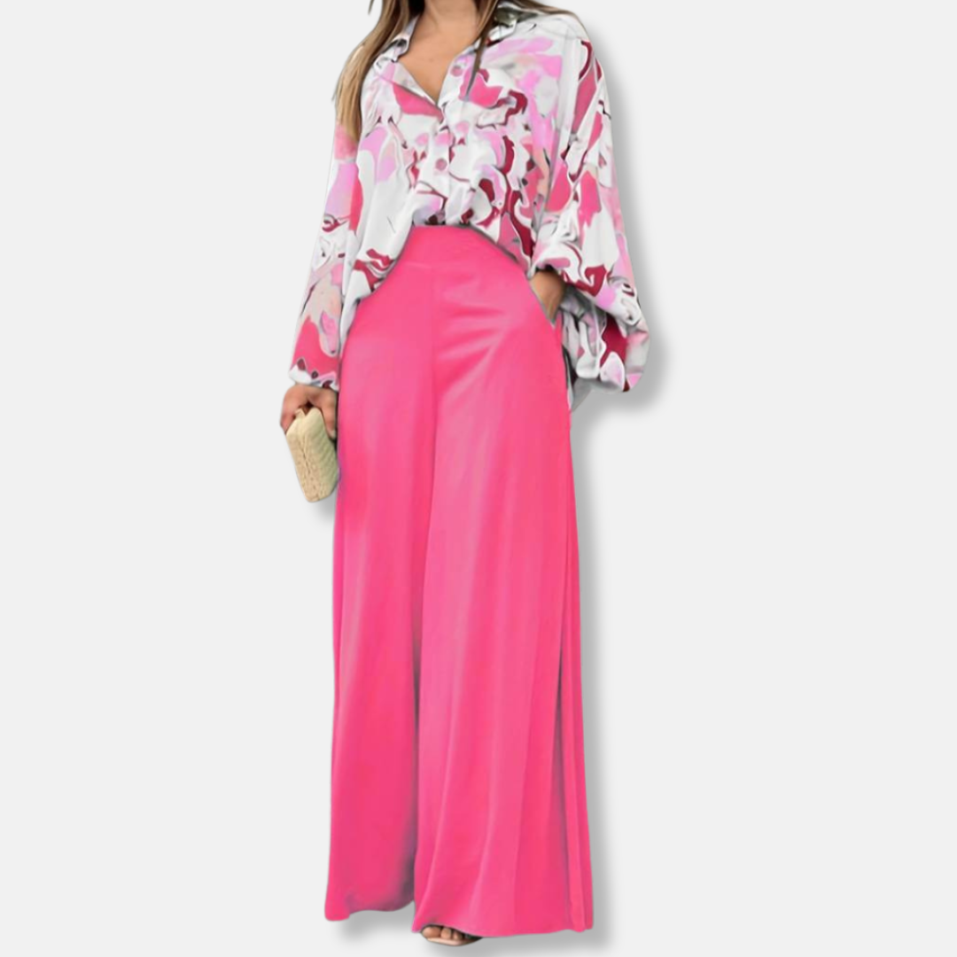 Dit tweedelige damesensemble, vervaardigd uit een soepel geweven stof, combineert een blouse met kraag V-hals en wijde mouwen met een bijpassende broek.