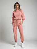 Deze tweedelige set voor dames, bestaande uit een coltrui en joggerbroek, is vervaardigd uit zachte gebreide stof en biedt een relaxte pasvorm voor optimaal comfort.
