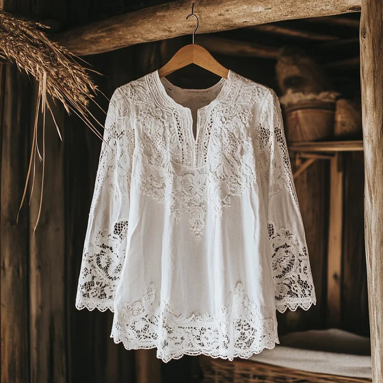 - Design: Relaxed passform med omfattande spetsbroderi, V-ringning och långa ärmar