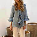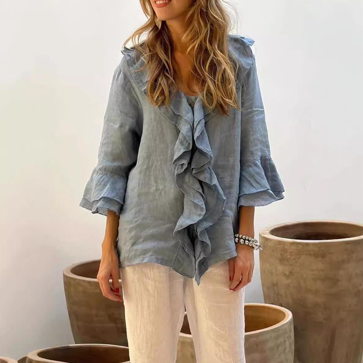Damer V-ringad Topp – Rymlig Passform – Volanger – Fladdermusärmar – Luftig Linne Look