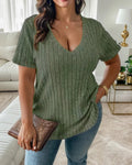 - Ontwerp: V-ringning, ribbad textur, avslappnad passform, korta ärmar