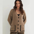 Upptäck Amstel-Mode-koftan med ribbstruktur och avslappnad passform. Denna stickade damkofta, med djup V-ringning och praktiska påsydda fickor, erbjuder ultimat komfort och en stilfull, casual look. Perfekt som en mångsidig stickad kofta för varje dag.