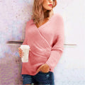 - Ontwerp: Wikkeltrui met V-hals, gebreid textuur en ribboorden