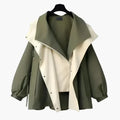 - Design: Lager-på-lager-design med breda slag, tryckknappsstängning och indragna ärmslut