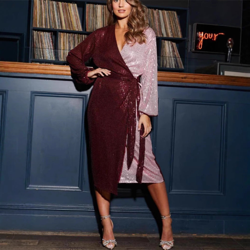 Dam Omslagsklänning – Slim Fit – Paljetter – Midi Längd – Långa Ärmar – Rosettbälte