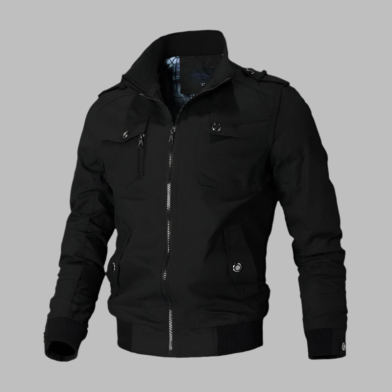 - Ontwerp: Klassiek bomberdesign met ritssluiting, ribgebreide boorden en functionele zakken.