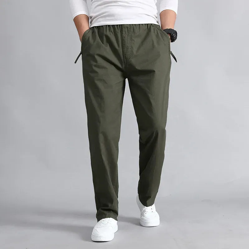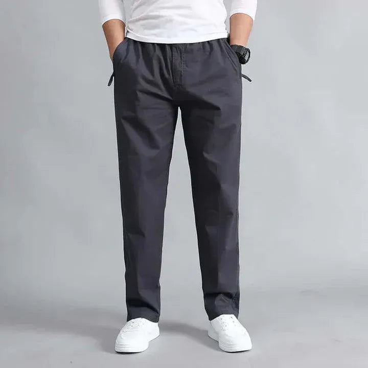 Deze herenbroek, gemaakt van een lichte geweven stof, biedt een relaxte pasvorm. Voorzien van een elastische tailleband met trekkoord voor comfort.
