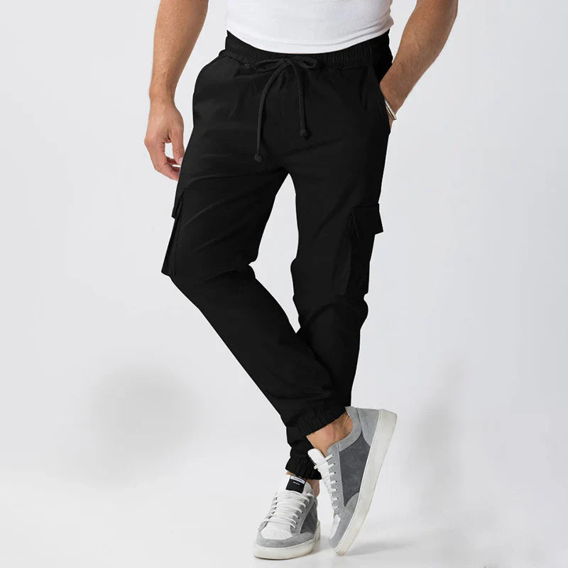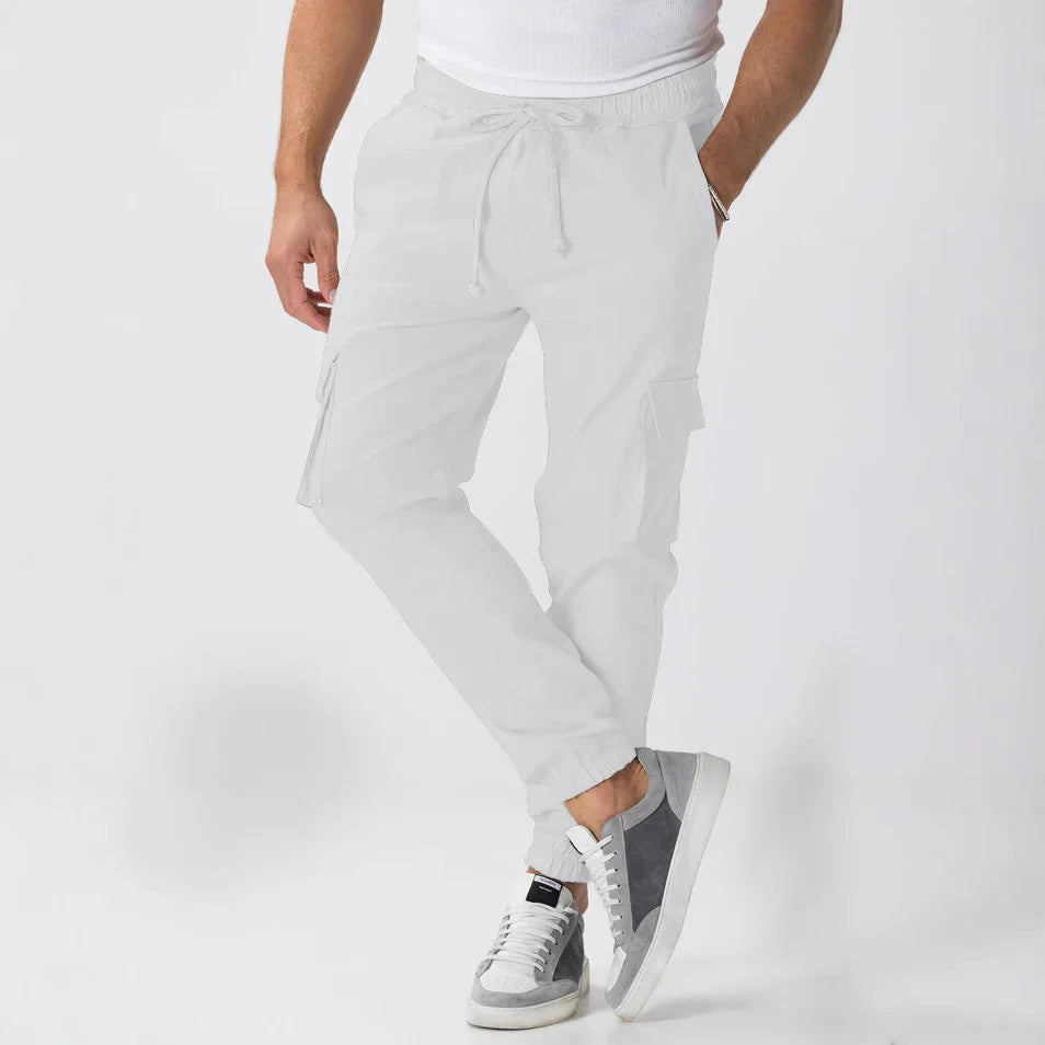 - Ontwerp: Relaxte taps toelopende pasvorm met cargozakken op de dijen.