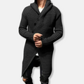 Deze heren cardigan is een lang, grofgebreid model met een sjaalkraag en capuchon. Het ontwerp kenmerkt zich door een asymmetrische knoopsluiting en een relaxte pasvorm.