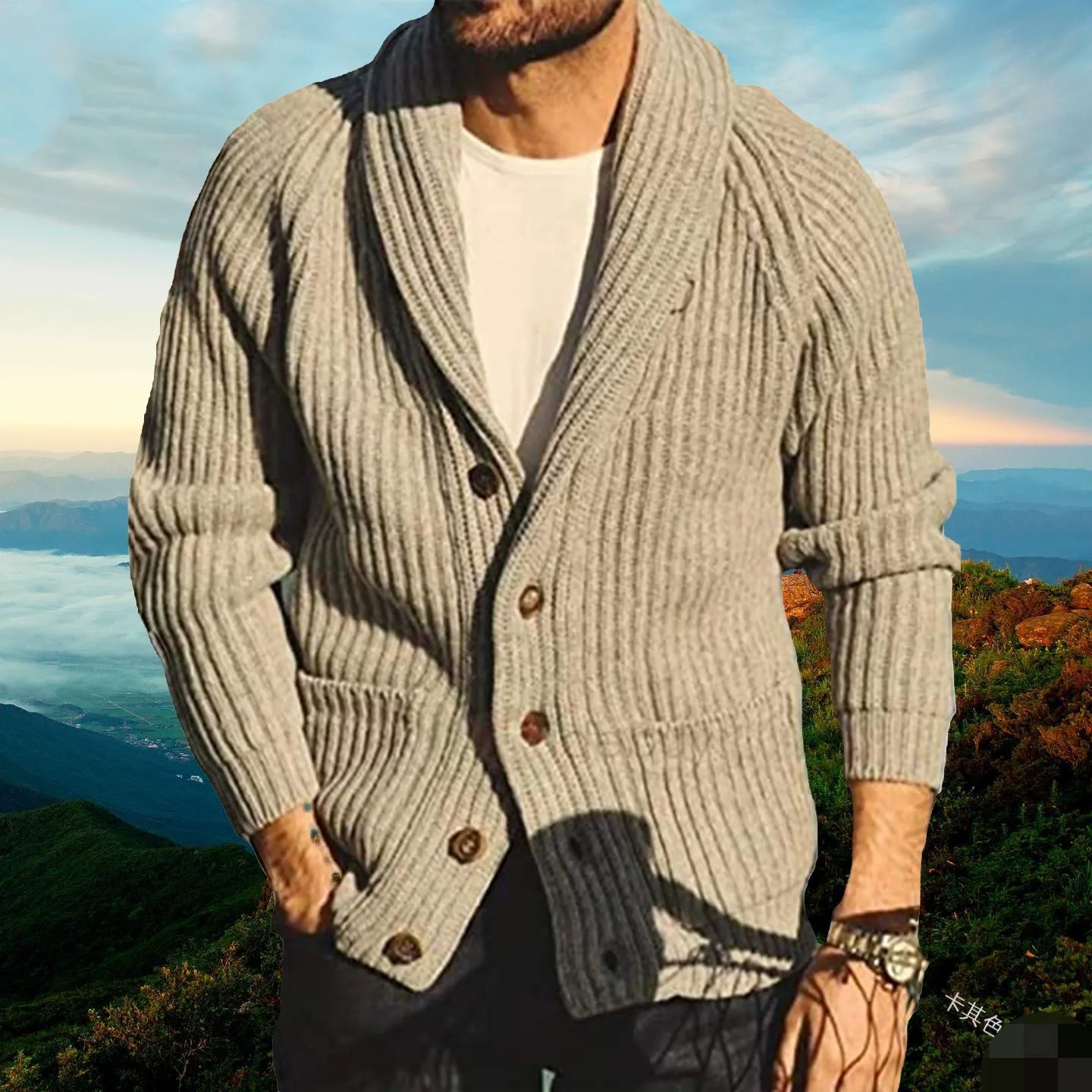 Heren cardigan met een slim fit pasvorm, uitgevoerd in een grof gebreide kwaliteit met opvallende verticale ribbels en een klassieke shawlkraag.