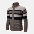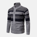 Deze heren cardigan, vervaardigd uit een wolmix, heeft een opstaande kraag en een doorlopende ritssluiting. Het ontwerp is voorzien van een horizontaal streepdessin.