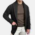 Deze heren cardigan, vervaardigd uit een wolmix met een robuuste ribgebreide textuur, heeft een sjaalkraag en valt op heuplengte. Het ontwerp omvat een knoopsluiting aan de voorzijde.