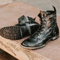- Ontwerp: Enkelhoog model met klassiek veterdesign, stevige zool met diep profiel en metalen oogjes