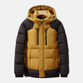 Deze herenjas, vervaardigd uit geweven synthetische stof met vulling, is voorzien van een afneembare capuchon en verstelbare manchetten voor praktisch comfort.