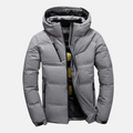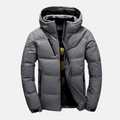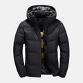 Deze herenjas is vervaardigd uit een geweven stof en voorzien van een gevoerde, doorgestikte constructie voor warmte. De jas heeft een capuchon en verstelbare manchetten.