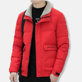 Deze heren jas, vervaardigd uit geweven stof, is gewatteerd en voorzien van een opstaande kraag. Het model heeft een taillelengte.