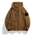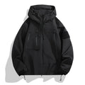 Deze heren jas is vervaardigd uit een gladde, matte geweven synthetische stof. Het model heeft een losse pasvorm met een gestructureerd silhouet en is voorzien van een hoge kraag met verstelbare capuchon.
