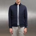 Deze heren jas combineert een slim fit bomberjack silhouet met een hybride constructie van geweven en gebreide stoffen. Het ontwerp kenmerkt zich door een gequilt voorpand en een staande kraag.