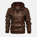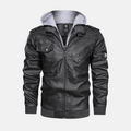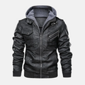Heren jas van imitatieleer met een opstaande kraag en afneembare capuchon. Voorzien van geribde boorden voor een comfortabele pasvorm.