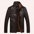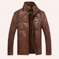 Deze heren jas van leer biedt een slanke pasvorm en is voorzien van een opstaande kraag. Het heuplange model combineert functionaliteit met een gestructureerde uitstraling.