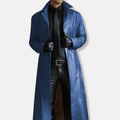 Introduktion av den långa kappan i läder med formell passform för herrar. Denna figursydda, fullängds kappa i PU-läder erbjuder ett strömlinjeformat utseende som är perfekt för formella och affärstillfällen, och skapar ett kraftfullt stiluttryck.