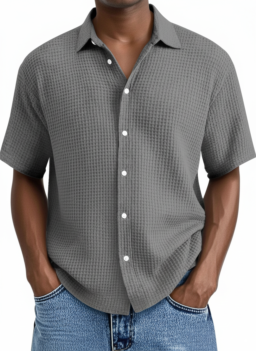 Upptäck vår Herrskjorta Kortärmad – Relaxed Fit – Våffelstruktur – Andningsbar Soft Knit. Denna bekväma skjorta med våffelstruktur erbjuder en avslappnad passform och är idealisk för lediga tillfällen tack vare det andningsbara tyget. Perfekt för sommaren.