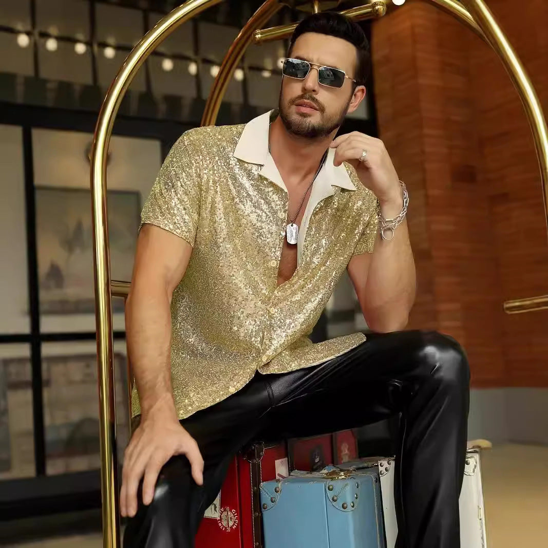 Gör ett oförglömligt intryck med denna Herrskjorta – Slim Fit – Paljettfinish – Korta ärmar Feststil från Amstel-Mode. Denna iögonfallande skjorta kombinerar en trendig slim fit med gnistrande paljetter och korta ärmar, idealisk för varje fest eller utekväll.