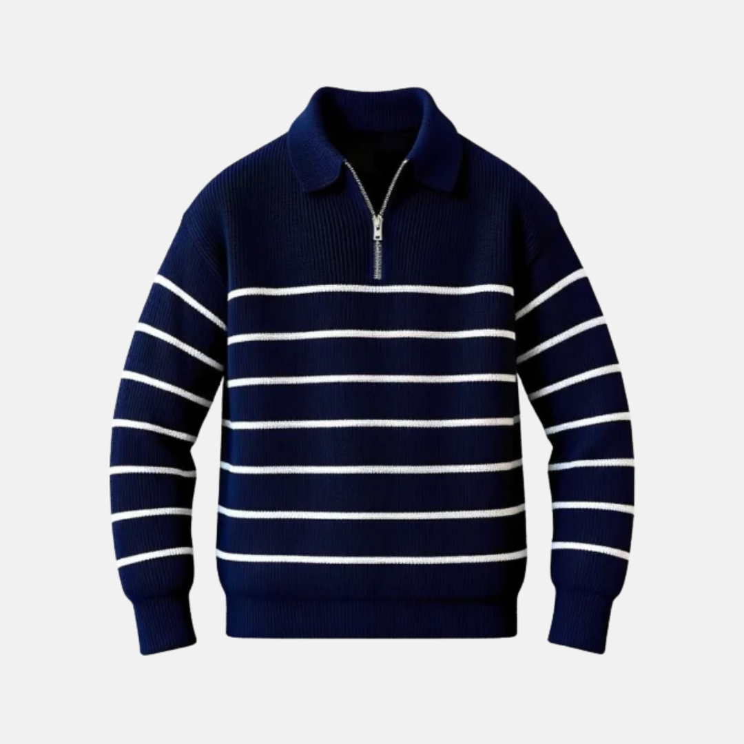 Herrtröja – Ullmix – Normal Passform – Halv-Dragkedja – Ribbstickad Avslutning – Nautiska Ränder