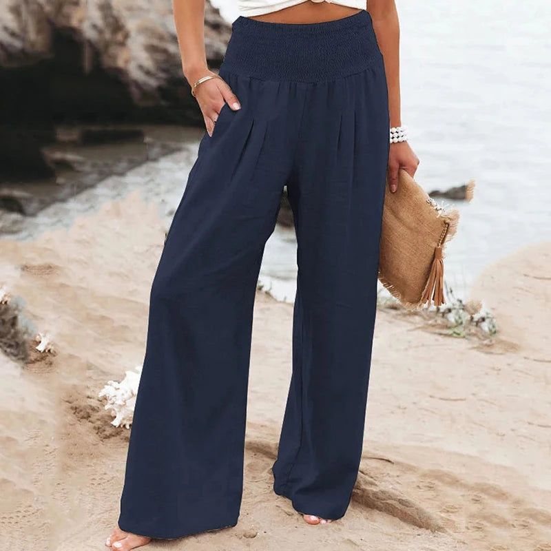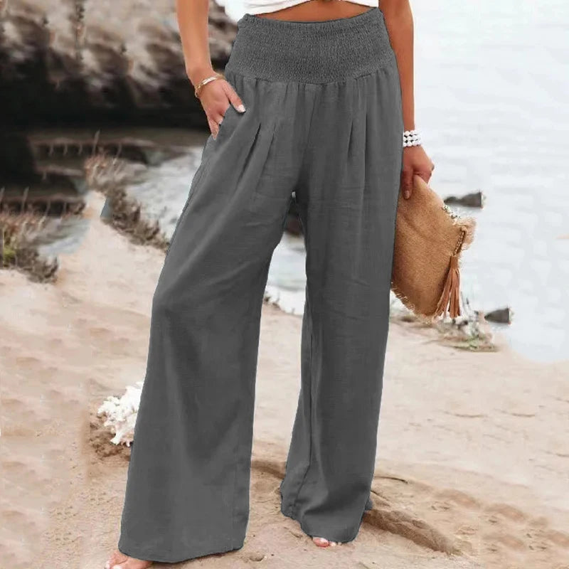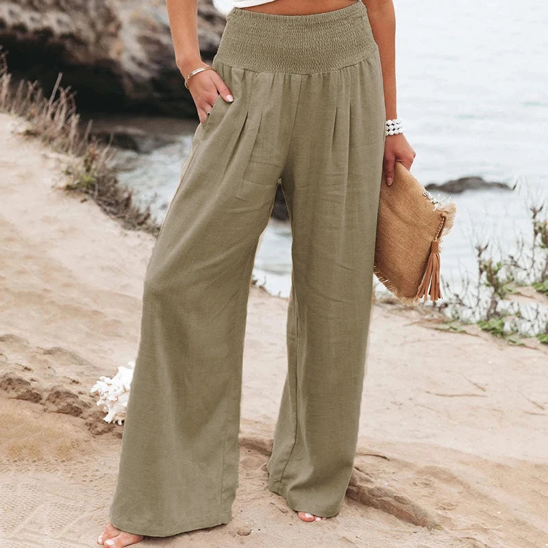 Dames Wijde Broek - Hoge Elastische Taille - Ademend Katoen/Linnen - Met Zakken. Geniet van ultiem comfort met deze ademende, wijde broek. De hoge elastische tailleband en handige zakken maken dit de perfecte keuze voor elke dag.